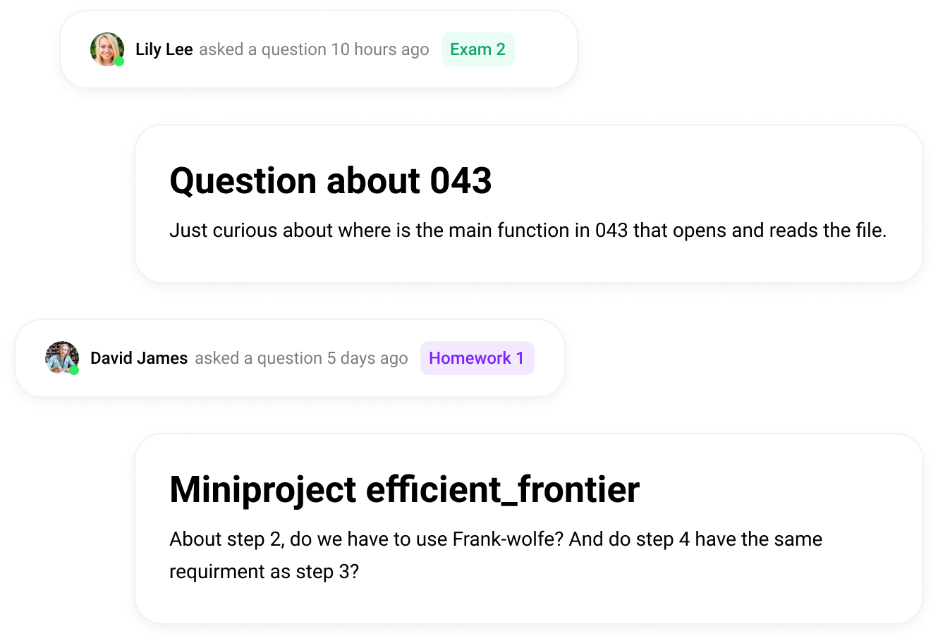 “Campuswire’s forum is amazing, so students actually use it without being coerced. So I end up spending less time answering student questions because they answer each other’s.”