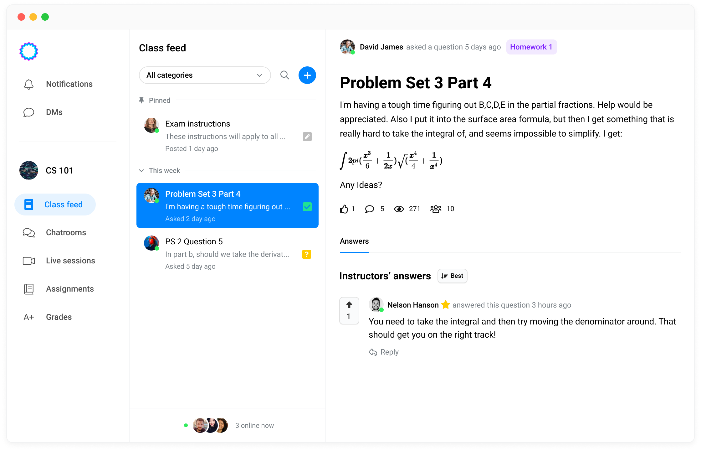 Students can ask questions in the class feed for their classmates and instructors to answer. Instructors can create discussion posts and easily share important announcements.
