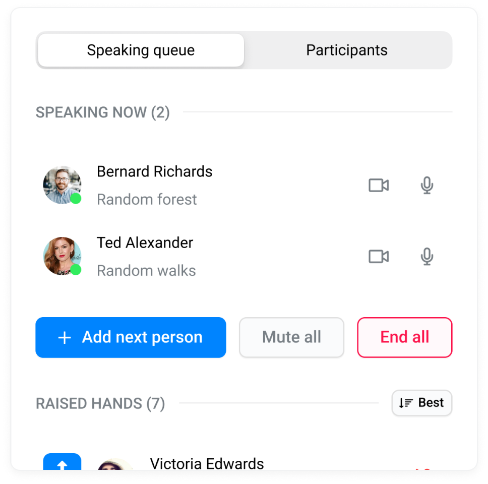 Students can "raise their hands" to be able to speak. To triage the student questions, students can upvote their peers question topics so the best questions get discussed first.